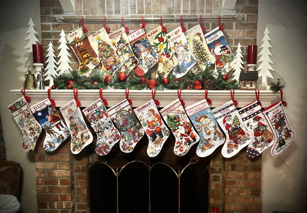 This afternoon Marlene finished her 19th Christmas stocking, thus completing a project that started 42 years ago. She made the first stocking when Josh was one year old. She made stockings for the two of us, and then she made stockings when Mark and Nick arrived. Then a long gap of more than 20 years until Josh married Leah. Soon thereafter, she made one when Mark married Vanessa. As the grandkids arrived, she made each of them a stocking. Along the way, Nick married Sarah. So one thing led to another, and now there are nineteen stockings hanging above our fireplace.